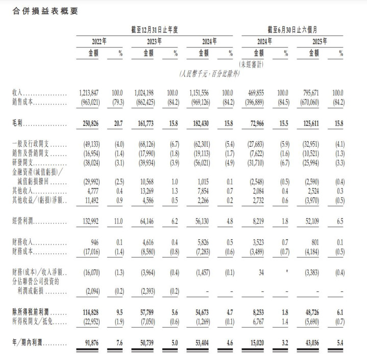 财务方面,于2022年、2023年、2024年、2025年截至6月30日止六个月,该公司实现收入分别约为12.14亿、10.24亿、11.52亿、7.96亿元人民币;同期,年/期内利润分别约为9187.6万元、5073.9万元、5340.4万元、4303.6万元人民币。